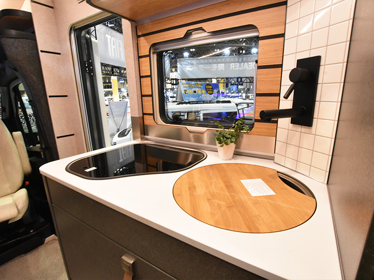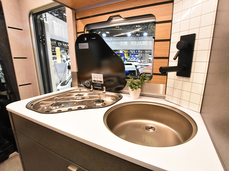 コンプレッサー式冷蔵庫は154Lのビッグサイズで、何週間もの長旅をする欧米のライフスタイルに適したものになっています。
